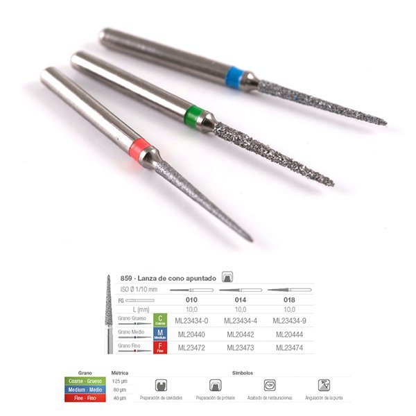FG 859C-010/5 | MEDICALINE | fRESA DE DIAMANTE fG PARA TURBINA CON fORMA DE CONO APUNTADO DE DIAMETRO 010 Y TAMAÑO DE GRANO GRUESO (COLOR VERDE).PRESENTACION EN BLISTER DE 5 UNIDADES.VELOCIDAD RECOMENDADA ENTRE 75000 Y 100000 RPM.