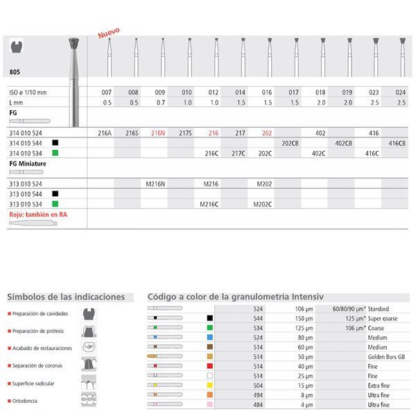 217S/6 | INTENSIV | fresas de diamante y carburo-tungsteno de alta calidad. Acabado muy uniforme, de bajo desgaste y duración muy superior a otras marcas (2-3 veces más). Eliminación de restos mejorado y optimas propiedades de enfriamiento. Tipos de Turbina, Contra-ángulo y Pieza de mano.Caja de 6 unidades.