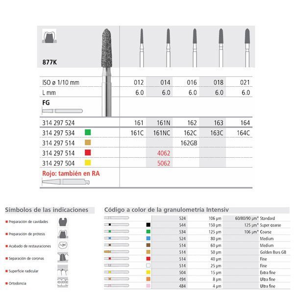 fresas de diamante y carburo-tungsteno de alta calidad. Acabado muy uniforme, de bajo desgaste y duración muy superior a otras marcas (2-3 veces más). Eliminación de restos mejorado y optimas propiedades de enfriamiento. Tipos de Turbina, Contra-ángulo y Pieza de mano.Caja de 6 unidades.