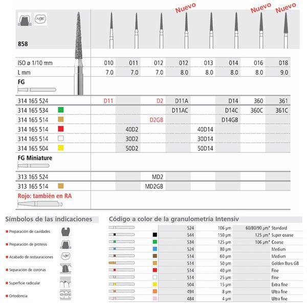 fresas de diamante y carburo-tungsteno de alta calidad. Acabado muy uniforme, de bajo desgaste y duración muy superior a otras marcas (2-3 veces más). Eliminación de restos mejorado y optimas propiedades de enfriamiento. Tipos de Turbina, Contra-ángulo y Pieza de mano.Caja de 6 unidades.